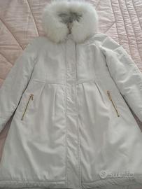 Con cappuccio e bordo in pelliccia sintetica bianca.