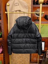 Piumino Gucci FW23FW con dettagli in nastro rosso e verde a contrasto e cappuccio con logo integrale. Questo piumino con zip fa parte della nuova collezione di accessori e prêt-à-porter. Realizzato in nylon riciclato, filo e passamanerie riciclati, presenta il motivo distintivo del marchio. Il tessuto è lucido e le finiture impeccabili, rendendolo un vero tesoro raro. Imbottito al 90% con piumino d'anatra bianco, ti terrà al caldo quest'inverno. Unisex, con cappuccio staccabile.