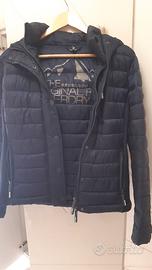 Piumino corto in vita e pesante da donna; blu scuro misura m..con tasche esterne come da foto. Modella sui fianchi e ha cappuccio con pelo staccabile. Nuovissimo praticamente. Occasione solo su