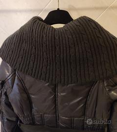 Piumino invernale di un blu molto scuro da sembrare nero. Sul davanti ha due piccole taschine con bottoncini automatici e due tasche più capienti con chiusura lampo invisibile. Ha una cintura elestica e chiusura lampo che si apre anche dal di sotto comoda per guidare. Il particolare più bello è il sovracollo di lana e fatto a ventaglio ampio; lo si puo chiudere con bottoni formando una possente sciarpa per quando fa un po' più freddo e lo si puòtogliere attraverso una cerniera taglia 42 italiana