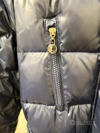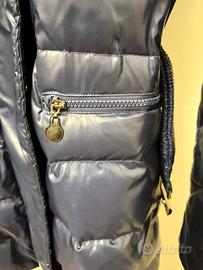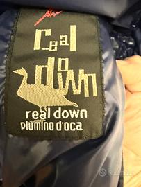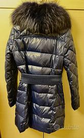 Piumino imbottito con vera piuma, con collo in pelliccia ecologica.Tasche laterali e sul petto .Chiusura frontale con cerniera e bottoni a pressione più cintura elasticizzata con chiusura in metallo che risulta un po' graffiata.Colore blu elettrico, indossato poche volte