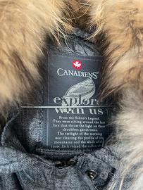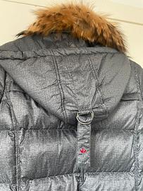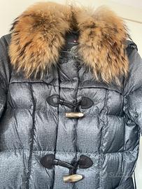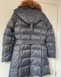 Piumino leggero colore grigio melange con cappuccio, tasche davanti, cintura, chiusura con cerniera e alamari scuri, seminuovo, taglia 42