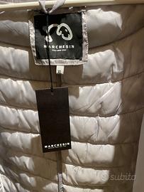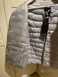 Piumino leggero, ottimo per mezze stagioni o sopra ad altri capispalla, mai indossato, grigio argento, con manche a tre quarti. Veste una taglia 46-48.