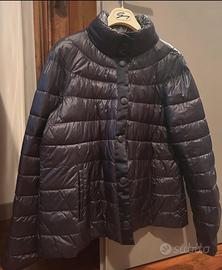 Piumino leggero duble face, indossabile da entrambi i lati: - un lato in blu - l'altro lato con fantasia geometrica nei toni del blu, bianco, azzurro e beige Modello corto con chiusura a bottoni automatici e tasche su entrambi i lati. Taglia E 48 I 50