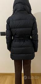 Piumino lungo marca Hetrego’ con cappuccio, collo di pelliccia e cintura in vita, taglia 48 colore blu scuro.Perfetto