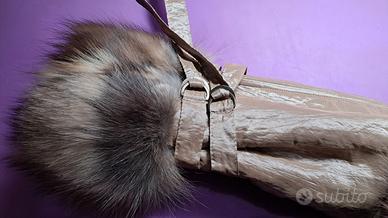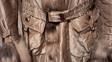 Piumino lungo Sonia Fortuna tg.44 color champagne con bordi in vera pelliccia di volpe, imbottitura interna poliestere, lunghezza alla caviglia, 2 ampie tasche e cintura elasticizzata, usato solo una volta, come nuovo