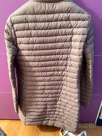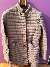 Piumino 100 grammi media lunghezza , fatto a cappottino, rosa antico/ tortora, molto elegante ,chiusura con bottoni, marca Sisley. Vera piuma d’oca