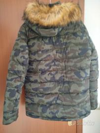 Piumino lungo con cappuccio nuovo e mai usato. colore verde mimetico stile militare. taglia XXL ma vaste piccolo. io sono alto 1.76 e mi sta perfetto.