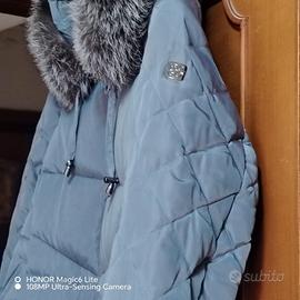 raffinatopiumino firmato Pregiò Couture, ideale per l'inverno. Il capo si distingue per il particolare colorazzurro polveree la lavorazione trapuntata geometrica che valorizza la figura.Ampio cappuccio con bordo in morbida pelliccia ecologica
