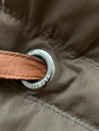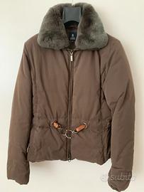 Giacca in piuma Marina Yachting colore marrone, tg 42. Stretto in vita da cintura in cuoio, passanti in metallo con logo, chiusura a zip ed originale gancio in metallo brunito lucido. Collo in lapin 100%, staccabile. Imbottitura 80% piumino, 20% piuma. Molto caldo.