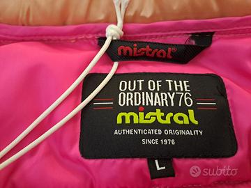 Piumino da donna/ragazza Mistral, color rosa albicocca, mai indossato, con etichetta, tg.L, maniche chiuse ad elastico, zip nera davanti, due tasche con zip, cappuccio removibile, con velcro per richiuderlo al collo, fodera a contrasto fucsia. Tessuto e imbottitura realizzati con criteri ecosostenibili, attraverso il riciclo di bottiglie in plastica. Perfetto e inconsueto!