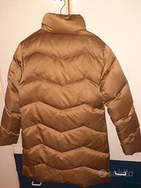 Piumino longuette Moncler, taglia 2, colore beige dorato, con zip centrale e sulle tasche laterali. Da segnalare una delle etichette interne tagliata.