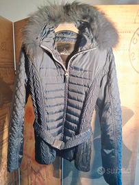 Piumino corto ( copre la schiena ,con la cintura.) Molto leggero,ma tiene caldo, in piumino naturale. Colore blu scuro molto bello.Portata,ma in ottime condizioni. La pelliccia è staccabile, c' è un leggero cappuccio che si nasconde nello collo e si chiude con la cerniera , tasche esterne con la chiusura cerniera , tasche interne con la stessa chiusura, tessuto anti pioggia. Non ha nessun segno di usura ( le maniche, tasche, macchie, difetti della stoffa ecc ecc)