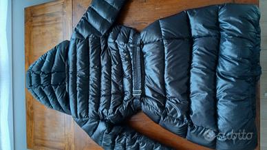 Piumino Deha con cappuccio staccabile + cintura, interno vera piuma, leggero e molto caldo. Spalle cm 48, maniche 67, busto 52, lunghezza totale 90