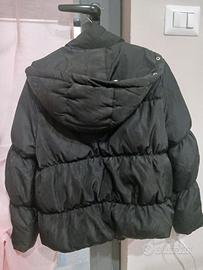 Piumino nero donna Zara, modello corto con collo alto e chiusura a zip e bottoni a pressione.
