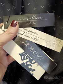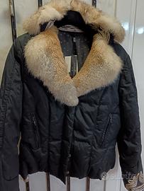 Giacca piumino nero in vera piuma d'oca, con collo staccabile in morbida pelliccia sfumata nei toni del beige, due tasche con cerniera sul davanti ed un taschino interno, impreziosito da dettagli decorati sui polsi e sul collo, abbottonatura con doppio cursore, nuovo in taglia M, bello e versatile per creare svariati look casual chic, per sbaglio misura, vendo ad euro 89.