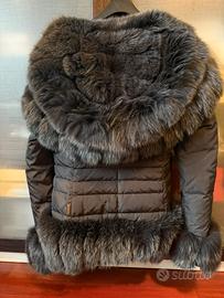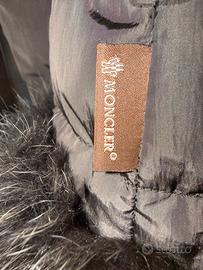 Vendo piumino Moncler originale con cappuccio, maniche e profilo rifinito in pelliccia autentica.