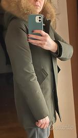 Taglia XS, colore verde scuro, imbottito simile al woolrich, pelo del cappuccio rimovibile
