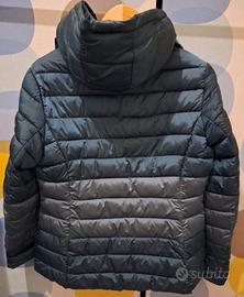 Vendo comodo e funzionale piumino della marca PEGGY-HO, con molte tasche, zip funzionanti, zip di chiusura che si apre anche dal basso, cappuccio a sgancio rapido, collo alto e particolare tonalità del colore che degrada da un verde petrolio scuro ad un grigio chiaro.
