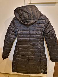 Piumino lungo trapuntato da donna, colore nero, taglia 38, double face, caldo e di facile vestibilità, con cappuccio e cerniera, le etichette sono all'interno delle tasche