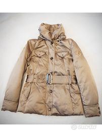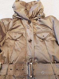 Giacca calda in vera piuma, praticamente nuova perché usata 2/3 volte, con cintura in vita e cappuccio estraibile, diverse taschine e polsini in maglia. Colore oro / beige. Marca Prani, giacca dal valore di oltre 100€.