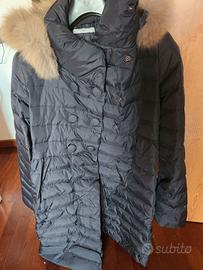 Piumino premaman con doppia fila di bottoni per l'avanzamento della gravidanza. Nero, cappuccio con pelliccia.