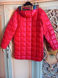 Si tratta di un piumino rosso con cappuccio della marca Benetton. L'indumento si distingue per la sua fodera interna a righe orizzontali multicolori, visibile all'apertura della zip e nel cappuccio.