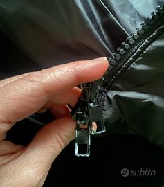 Il piumino ha una fascia elastica inferiore che si puó portare lunga (come in prima foto) oppure ripiegata verso l’interno (come in 3ª foto) andando quindi ad ‘accorciare’ il giaccotto.