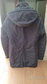 Colore blu notte, cappuccio integrato e tasche laterali.