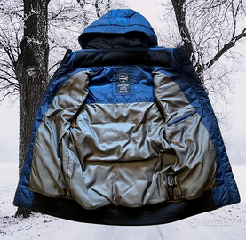 Piumino blu trapuntato molto caldo taglia M. Indossato pochissime volte, ulteriori immagini a richiesta. Veste slim. Cappuccio rimovibile 4 tasche con cerniera + 1 interna.