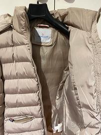 Bellissimo piumino sintetico, imitazione Moncler, con cappuccio e cintura in vita Colore beige, taglia L