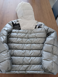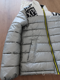 Piumino Sisley molto caldo con cappuccio. Colore grigio chiaro metallizzato e bianco. Cerniera giallo fluo. taglia 2xl unisex, eta 11-12 anni 160cm altezza