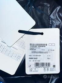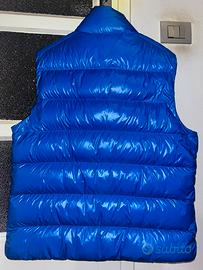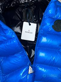 Piumino in piume d’oca blanca e nylon, smanicato, moncler, blu elettrico, veste giusto. Usato una volta ma ancora con cartellino, prezzo originale (715€) ed etichette.