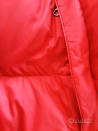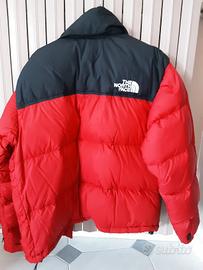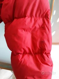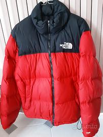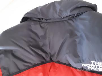piumino uomo THE NORTH FACE, taglia M, color rosso e nero. cappuccio estraibile dal colletto, cerniere perfette unica pecca sono due macchioline, come da foto, su manica e vicino zip.