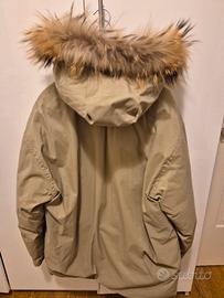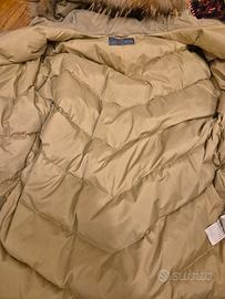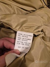 Piumino in vera piuma, tipo Woolrich Artic Parka, colore sabbia taglia XL.