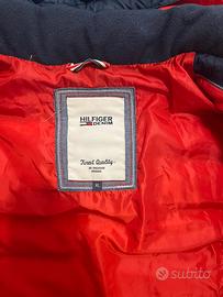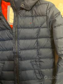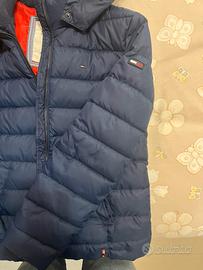 Vendo per cambio modello, piumino con cappuccio, dalla finitura idrorepellente. Caratteristiche principali • Nylon • Idrorepellente • Imbottito in piuma • Cappuccio rimovibile • Zip integrale • Due tasche a filetto ad angolo sul davanti • Branding Tommy Hilfiger Denim • Bandierina Tommy ricamata sul petto e sulla spalla sinistra. Modello e vestibilità • Regular fit • Taglia XL