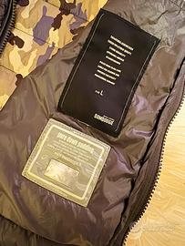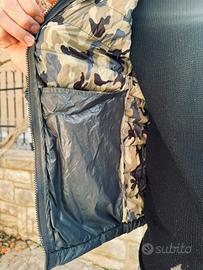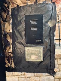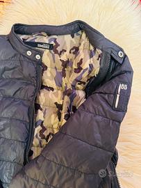 Piumino da uomo marca Bomboogie, imbottito in vera piuma d’oca, come si attesta dall’ultima foto. Taglia L, misure precise: altezza 68 cm, vita 50 cm. Dotato di due tasche esterne laterali e due ampie tasche interne. Il piumino non ha segni di usura se non l’allacciatura da sostituire, motivo del prezzo di vendita così basso.