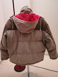 Giaccone da sci imbottito in vero piumino d'oca, idrorepellente, antivento. cappuccio ripiegabile e chiudibile dentro il colletto, chiusura con zip e bottoni a pressione, 2 tasche a patta, 2 a taglio verticale con zip, 1 in fodera interna. Colore cachi e grigio esterno, rosso interno.