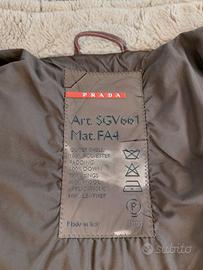 Piumino, brand PRADA orginale 100%, color marrone scuro con collo in montone beige, inserti in pelle marrone (torace, polsini e fibbia posteriore) e polsini/fascione in vita di color verde scuro; cappuccio nel collo e mai utilizzato.