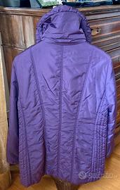 GERRY WEBER piumino viola scuro. Taglia 46. Due tasche esterne verticali, 1 tasca interna con bottone. Chiusura lampo e bottoni. Il collo può essere allacciato più alto e più basso. Leggero e caldissimo. Dimensioni in foto: altezza 75, larghezza ascelle 55. Come nuovo. Vendo perché sono aumentata di taglia. Perfetto, lavato e sanificato