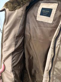 Piumino Zara donna, color beige, tasche laterali, collo pelliccia e cappuccio rimovibile. Caldissimo.