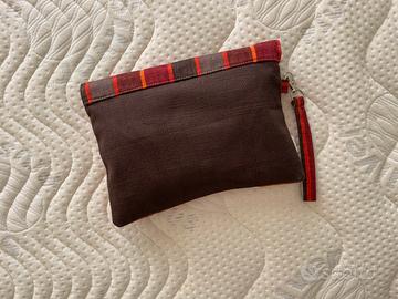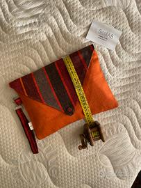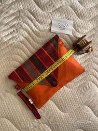 Pochette a fantasia arancione, marrone, rosso.