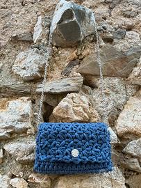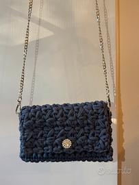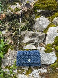 Articolo realizzato a mano all’uncinetto. Pochette con bottone calamitato, anellini e catenella removibile.