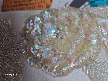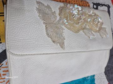 Pochette elegante in pelle, anni 80, usata poco e tenuta conservata tutti qstii anni. Colore panna internamente nn ci sn tasche, abbastanza capiente. Il fiore è di perline e pagliette