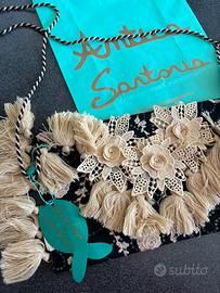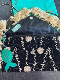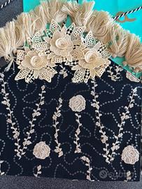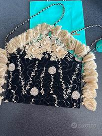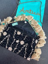 Pochette donna marca Antica Sartoria, nuova con cartellino, taglia unica, colori nero e panna, con paillettes e nappine, misure 30x18 cm, mai indossata, con tracolla. Prezzo 20€ con busta compresa.