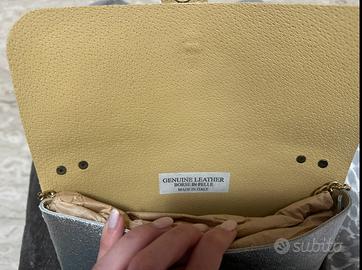 Splendida borsa modello bustina realizzata in vera pelle di alta qualità con finitura laminata argento. Un accessorio elegante e versatile, perfetto per cerimonie, serate o per dare un tocco luce a un look casual.