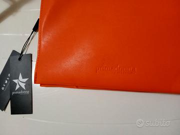 Pochette arancio Primadonna Nuova con cartellino. Tracolla ancora confezionata. Misure: Larghezza 24 cm Altezza 17 cm