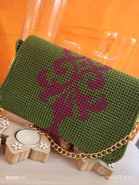 Pochette taglia media,lavorata con cordino thai verde e borgogna, rifinitura interna in raso nero e dettagli in color oro.