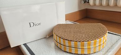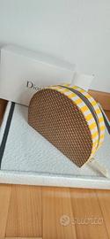 la pochette è in tessuto giallo e beige con dettagli effetto paglia intrecciata.