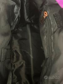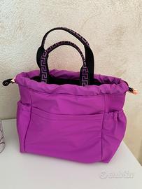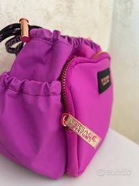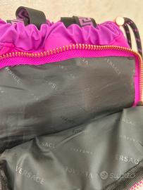Pochette/beautycase Versace donna Misure cm 22x 16x14 circa grosso modo Con scomparti esterni di cui uno con chiusura zip Con doppio manico e coulisse con fermagli per chiuderla . Interno foderato con taschino e zip e dalla parte opposta elastico ferma oggetti piccoli tipo matite mascara ecc Nuovo msi usato con protezione sul cursose esterno .